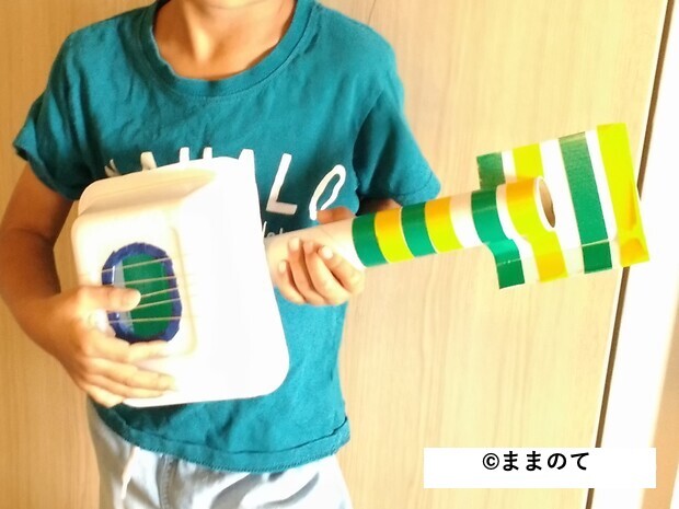 食品トレーやカップ焼きそばの容器に輪ゴムをピンと張ると、ギターを作ることができます。子どもの身体の大きさに合わせて作ると、子どもが喜びそうですね。