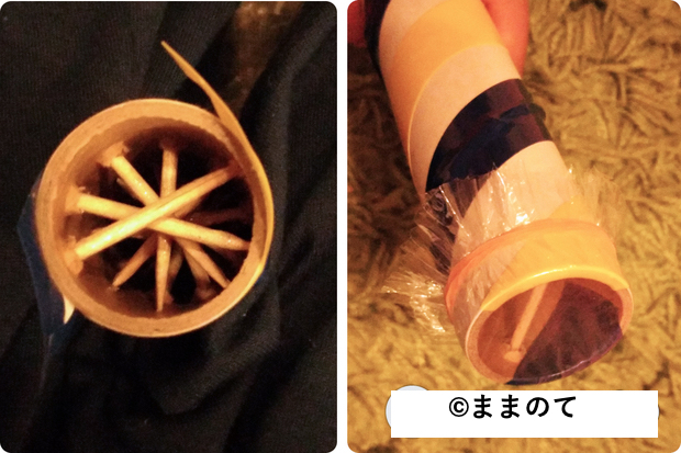 6.小さく切ったビニール袋か厚めのラップを、ラップの芯の端にかぶせて輪ゴムでふたをしたら完成。