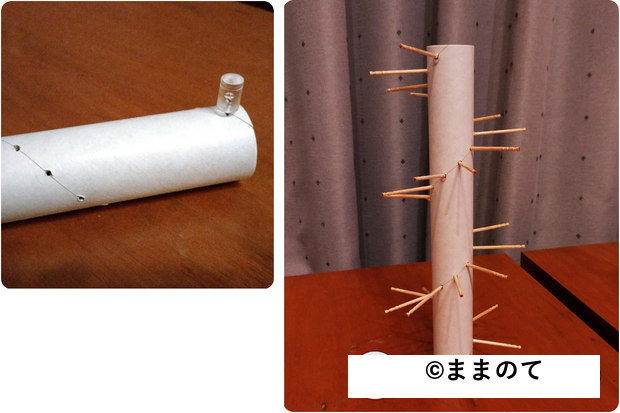 ラップの芯につまようじを刺して、中にビーズなどを入れることでレインスティックを作ることができます。