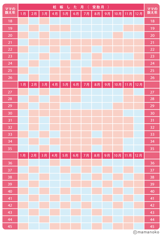 中国式産み分けカレンダーでは、赤ちゃんを妊娠したときの「ママの年齢」と「妊娠した月(受胎月)」から赤ちゃんの性別を予想します。ただし、中国式産み分けカレンダーが作成されたのは700年も前なので、年齢や暦の数え方が現在とは異なります。