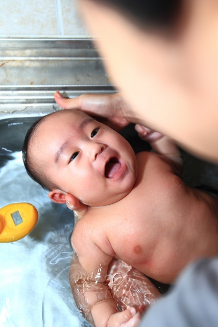 赤ちゃんは成長とともに動きが活発になってきます。沐浴中、手足を動かす赤ちゃんもいることでしょう。沐浴で赤ちゃんが手足を動かし、ベビーバスの周りが水浸しになってしまうようになったら、赤ちゃんが大きくなってきた証拠です。その後の片付けも大変なので、お風呂デビューをすると良いでしょう。
