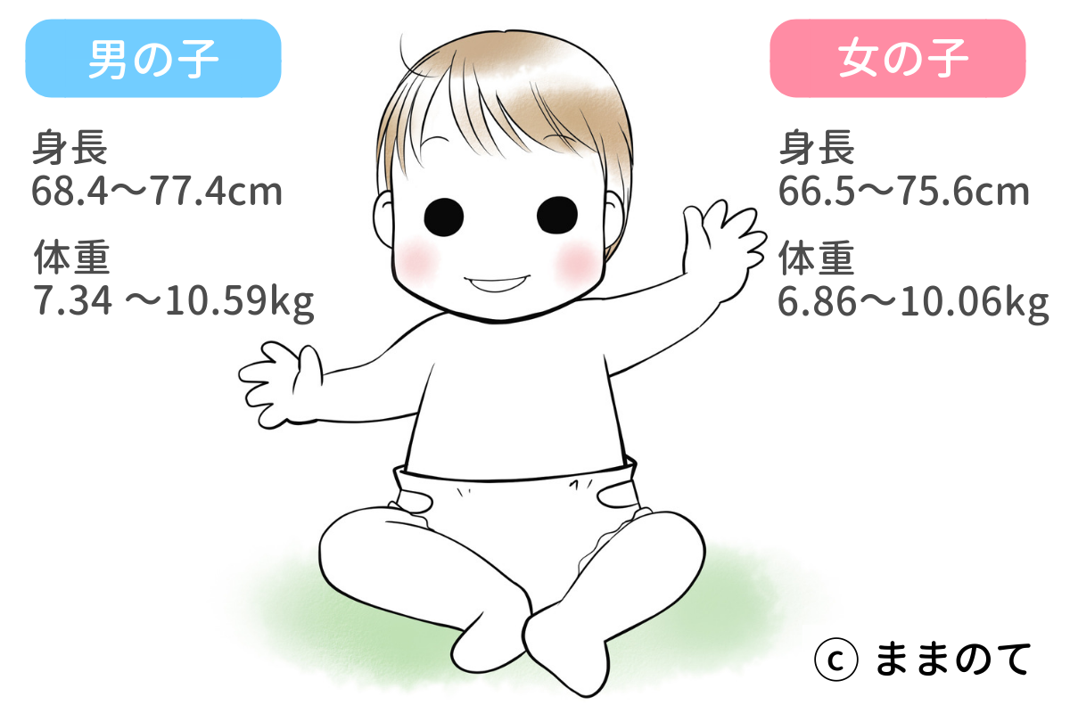 赤ちゃんは生後10ヶ月になるころには、しっかりとした幼児体形に変化していきます。生後10ヶ月の赤ちゃんの身長・体重の目安は以下のイラストの通りです(※1)。