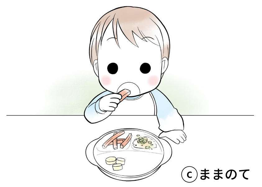 食事に意欲的な赤ちゃんの場合、生後10ヶ月頃から自分で食べ物をつかんで口に運ぶようになります。赤ちゃんが手づかみで食べやすいパンやスティック野菜、ひと口サイズにカットした果物などを用意しましょう。