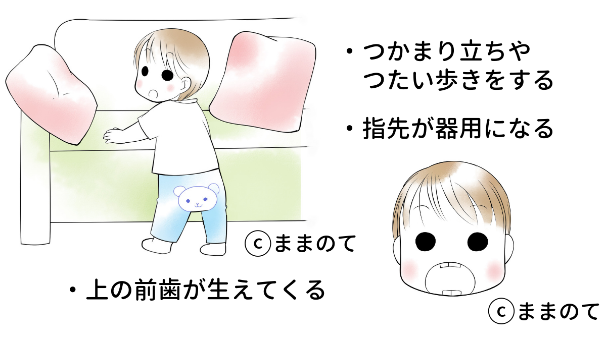 つかまり立ちやつたい歩きをするようになり運動量が増えますが、食事量はあまり変わらないため、体重の増加のペースは落ち着いてくる時期です。この時期は体重がまったく増えない赤ちゃんもいますが、機嫌良く過ごせていればあまり心配はいりません。