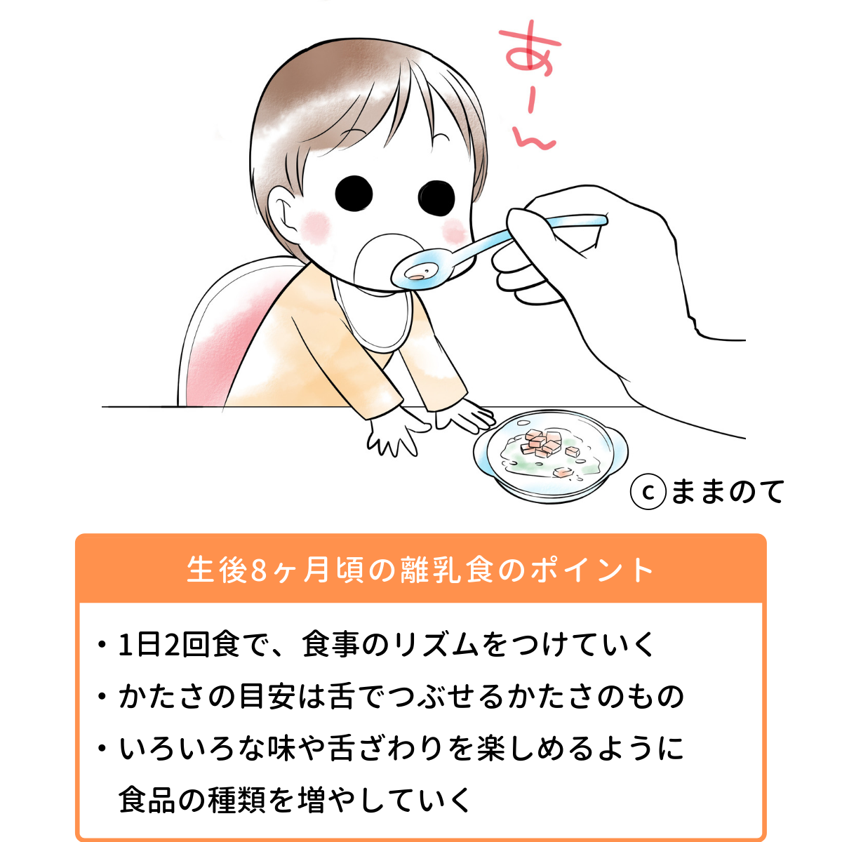 生後8ヶ月は1日2回の離乳食を定着させる時期です。モグモグと口を動かして飲み込む練習ができるように、食材は舌でつぶせるくらいのかたさに調理しましょう。