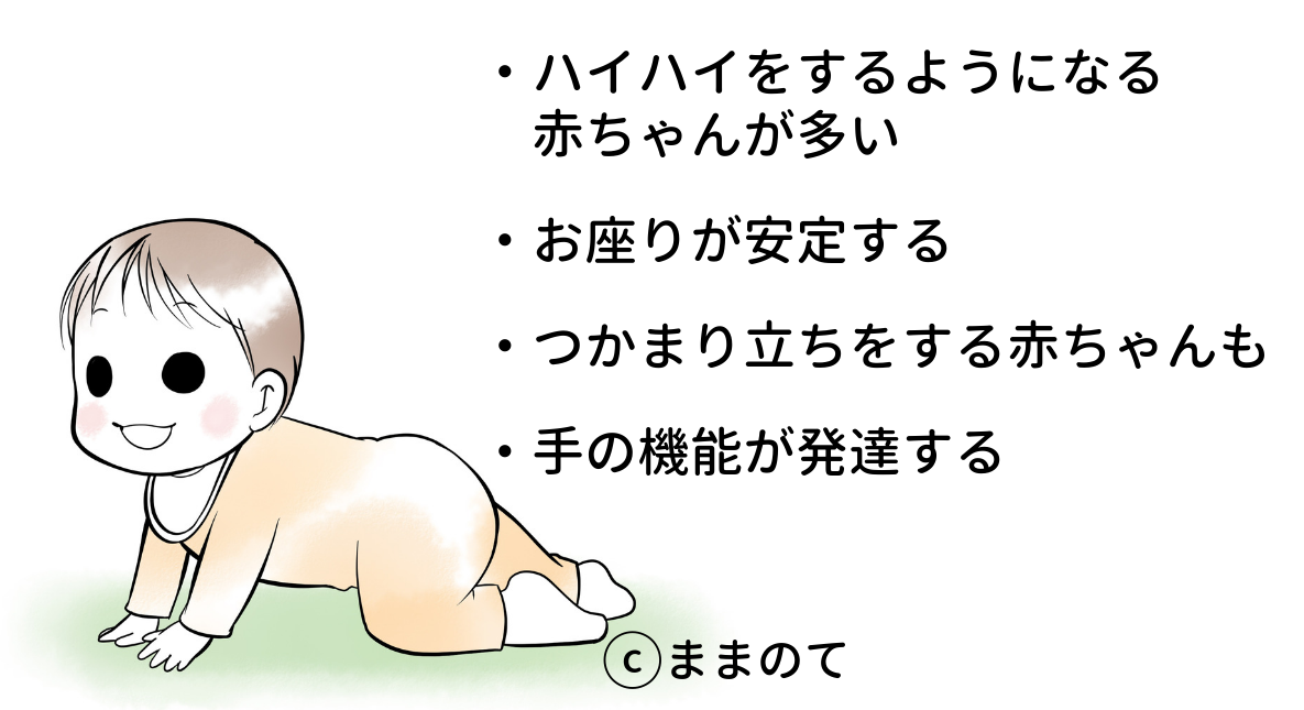 生後8ヶ月になるとハイハイをする赤ちゃんが多く見られます。ただし、成長には個人差があるので、できなくてもあせる必要はありませんよ。ずりばいを続ける赤ちゃんや、ハイハイをしないでつかまり立ちをする赤ちゃんなども珍しくありません。