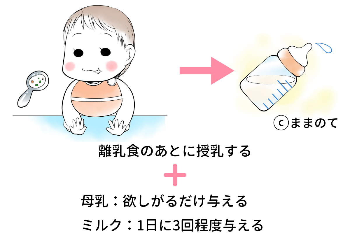 これとは別に、母乳は赤ちゃんが欲しがるだけ、ミルクの場合は200~220mLを1日3回程度与えましょう。授乳の回数は合計で1日4~5回が目安です。