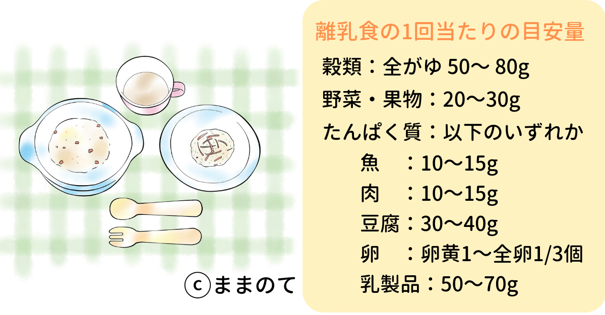 生後8ヶ月の赤ちゃんの1回あたりの離乳食の目安量は上記イラストのとおりです(※2)。ただし、食べる量には個人差があるので、このとおりでなくてもかまいません。赤ちゃんのペースに合わせて調整しましょう。