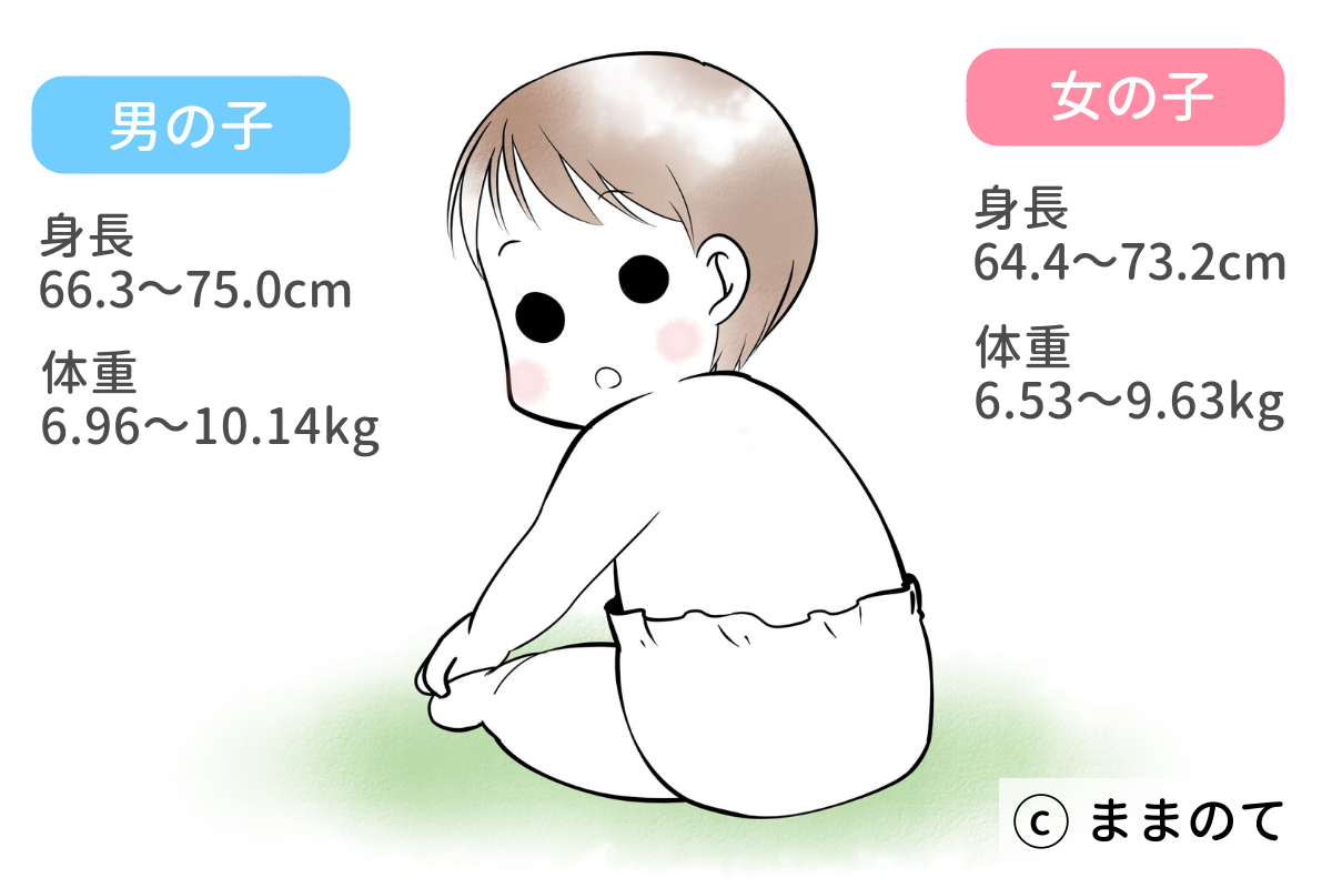 生後8ヶ月の赤ちゃんの身長と体重の目安は以下のイラストのとおりです(※1)。ハイハイをしたり手足をよく動かしたりと運動量が増える時期なので、一時的に体重が増えないことがありますが、元気な様子であれば特に心配はいりませんよ。