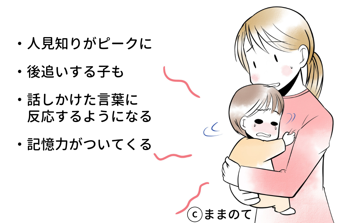 生後6~7ヶ月頃から始まる人見知りは、生後8ヶ月頃にピークを迎えます。同時に後追いも始まり、トイレにもゆっくり行けないとママを悩ませるかもしれません。人見知りも後追いも、ママと他人の区別がつくようになった成長の証であり、治せるものでもないため、時期が過ぎるのをおおらかな気持ちで待ちましょう。
