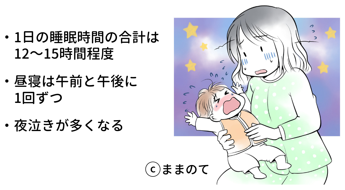 生後8ヶ月の赤ちゃんに必要な睡眠時間は12~15時間程度とされています(※3)。昼夜の区別がついて生活リズムが整い、ハイハイなどで日中の運動量が増えるため、夜に長く寝ることが多くなります。