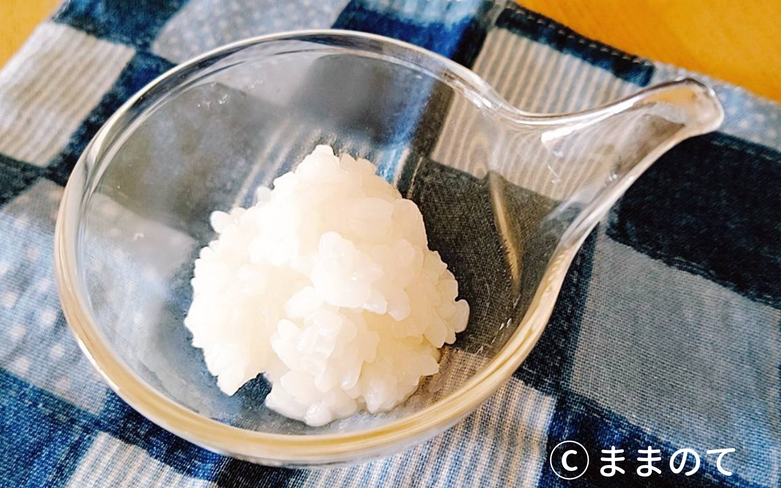 完了期に食べるご飯は軟飯で、歯ぐきで噛めるかたさが目安です。お米1:水3(3倍粥)程度の水加減で炊きます。様子を見ながら水の割合を2に減らしていきましょう。手づかみ食べができるようになったら、軟飯で小さなおにぎりを作るのもおすすめですよ。