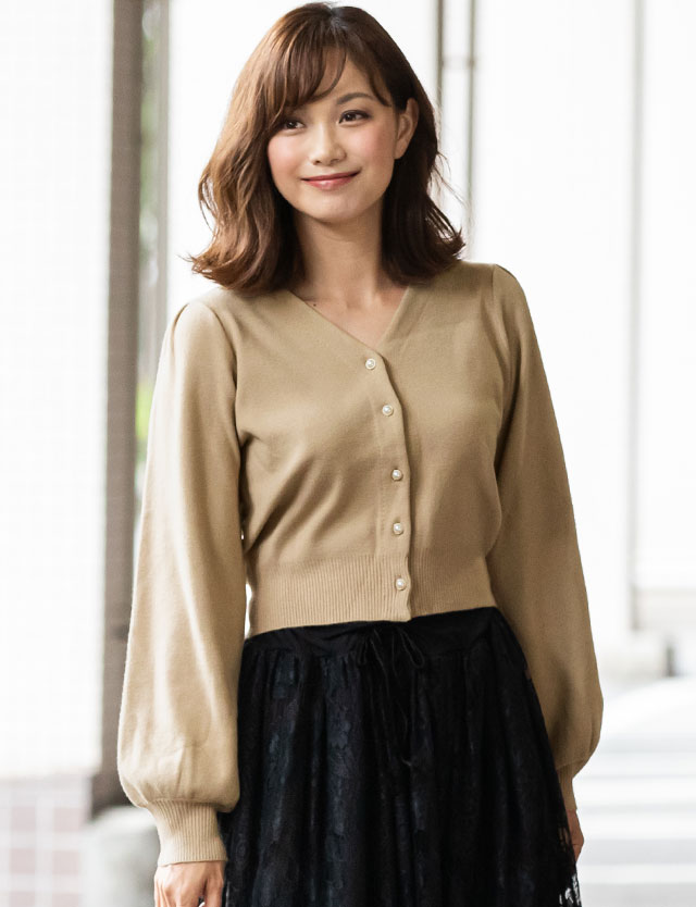 チクチクせずに滑らかな肌触りが特徴のレーヨン混ニットでつくられたカーディガンです。パフスリーブとVネックのデザインが気になるスタイルをカバーしてくれますよ。ワンピースとの相性も抜群。肌寒い時にサッと羽織れるのが嬉しいですね。