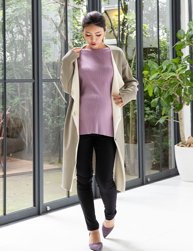 暖かみがありながらさらりとした肌触りの起毛トップスです。飾らない一枚で、妊婦健診時もリラックスした気分で診察を受けられそうですね。ストレッチが効いており動きやすいので着心地も抜群ですよ。