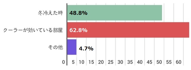 冬の寒さには約半数が回答。妊婦さんでなくても冷えを感じやすい季節なので当然ですね。しかし、それよりも多かったのが夏場のクーラーによる冷えです。自宅では自分で調節できますが、職場や病院、公共の場など自分の力ではどうにもできない場所に行くときは、羽織りものを持参するなどの対策が必要でしょう。