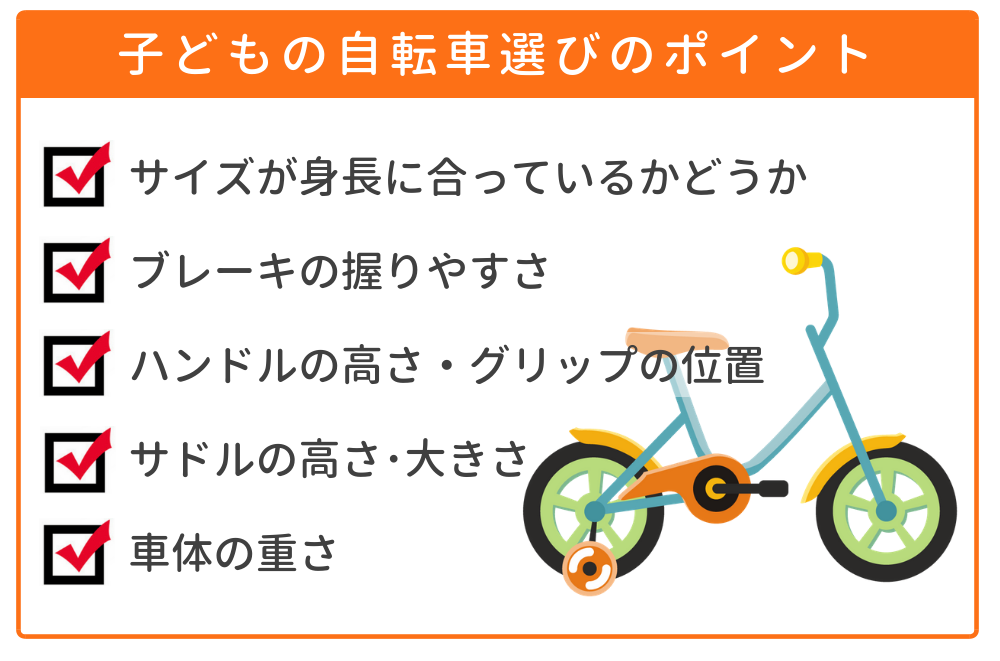 子どもは力が弱く、大人に比べて注意力が未熟なため、安全に自転車に乗れるように大人が気を付けてあげる必要があります。特に大切なのは、自転車のサイズが子どもの体形に合っているかどうかです。ブレーキの握りやすさやグリップの位置、サドルの高さ、車体の重さなどをチェックしましょう。
