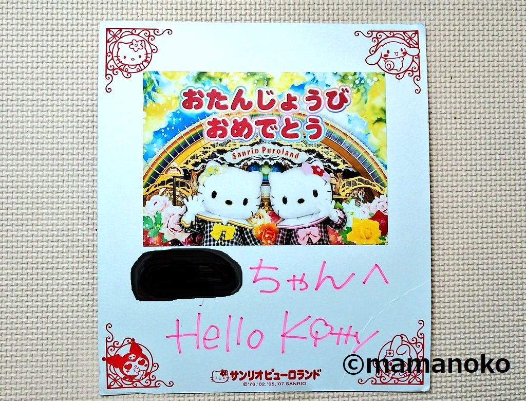 当日は娘の誕生日ということで、キティとミミィの「アニバーサリータイム」を予約していました。貴重なキティたちのショーが楽しめるだでなく、記念撮影や子どもの名前入りの色紙がもらえるなど、特別な時間が過ごせましたよ。
