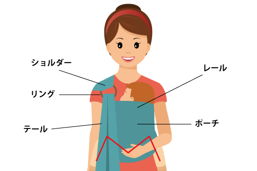 スリングは次の5つの部分で構成されています。各部の名称をおさえておけば、スリングでの新生児の正しい抱き方を理解しやすいでしょう。