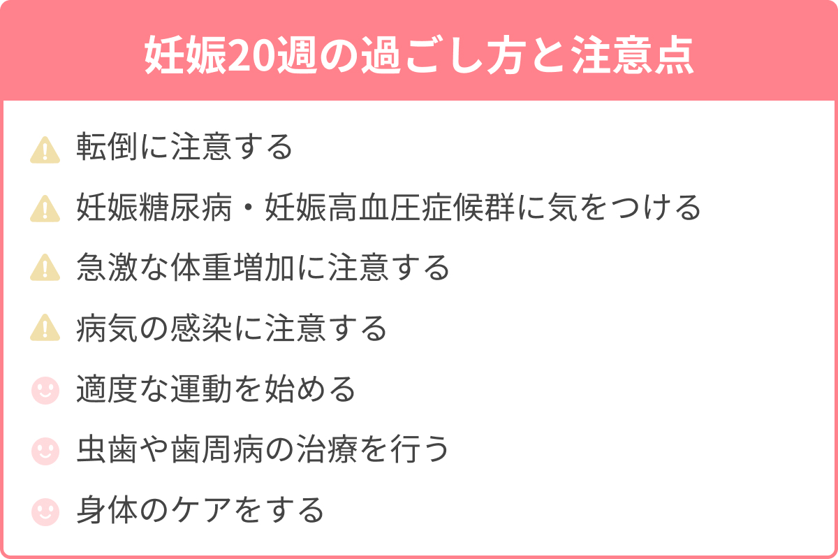妊娠20週になると、子宮は大人の頭を上回る大きさになります。お腹のほうに重心が偏ってくるので、背骨や腰に負担がかかり、腰痛や股関節痛を感じることもあります。重心がずれている状態にまだ慣れていないママが多いので、バランスを崩して転びやすくなります。移動のときは十分に注意しましょう。