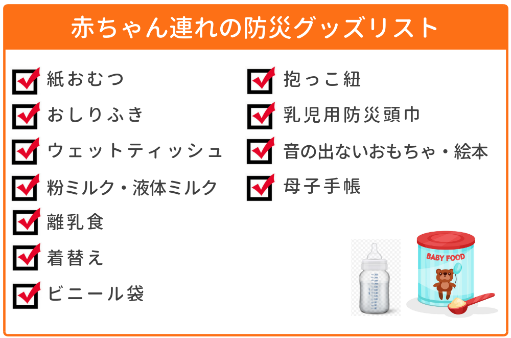 災害時に赤ちゃんの安全を確保して命を守るために、一般的な防災グッズに加えて日常的に使用するベビー用品を用意しておきましょう。