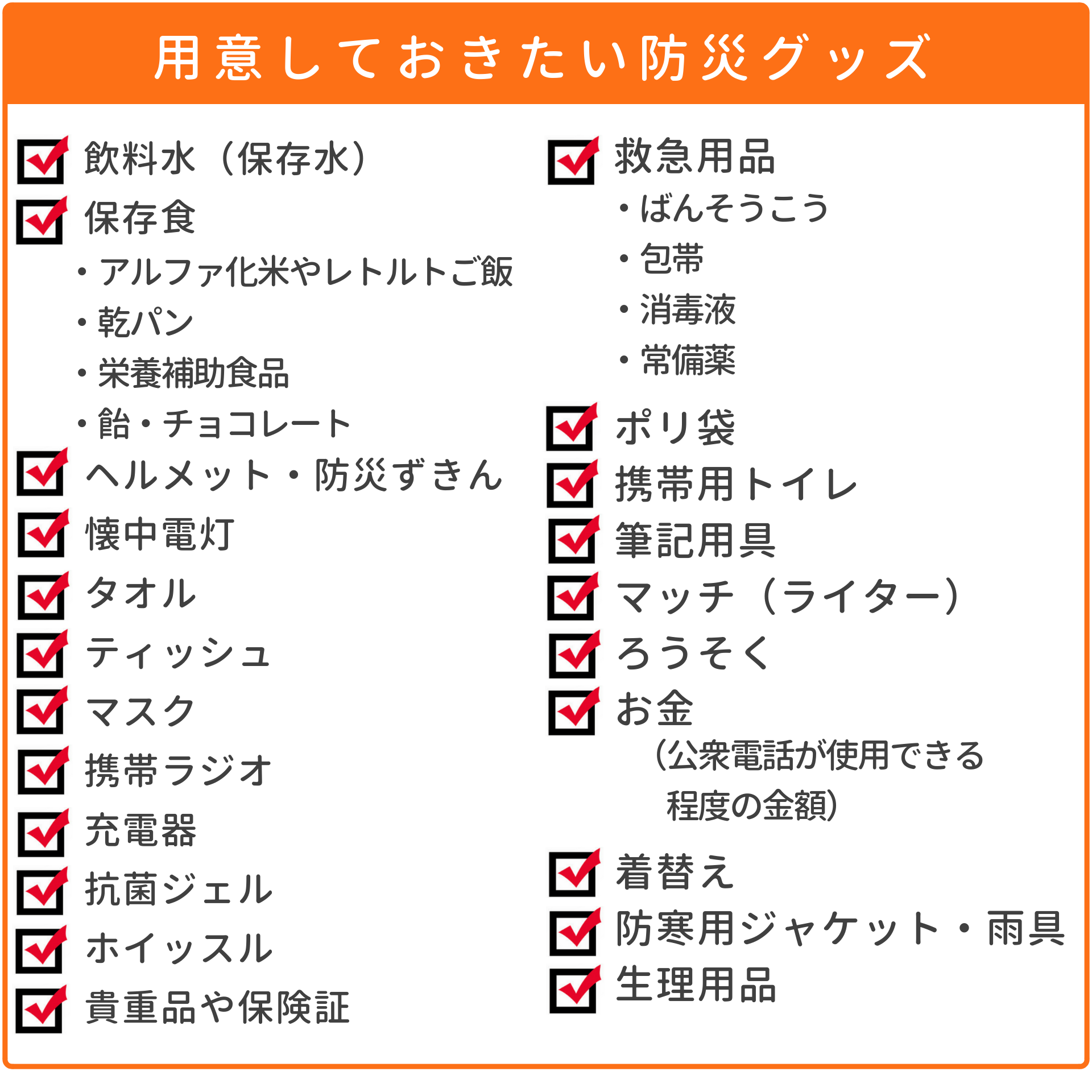 防災グッズは、身の安全を守るためのアイテムと、安全が確保できる場所で救援物資が届くまで過ごすための備蓄品とにわけることができます。災害が起こったときのために、最低限用意しておきたい防災グッズをリストで確認しておきましょう。