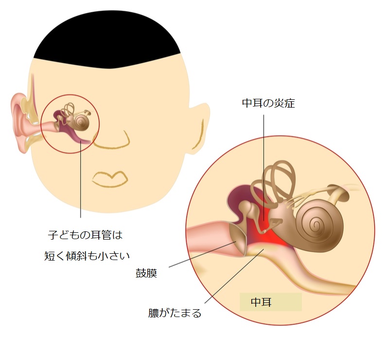中耳炎にかかりやすい原因のひとつが、赤ちゃんの耳の構造です。耳管と呼ばれる耳と鼻をつなぐ管から細菌を吸い込み、細菌が中耳にたまることで、中耳炎を引き起こします。赤ちゃんは大人と比べると耳管が短く、なおかつ水平なため、中耳に細菌がたまりやすいのです。