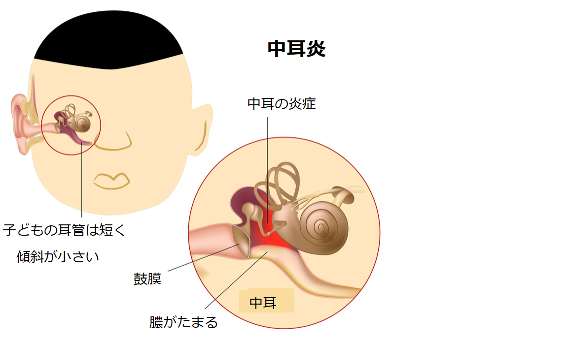 中耳炎とは、細菌やウイルスが中耳に入り、炎症をおこし膿がたまる病気です。多くの場合、風邪や副鼻腔炎など細菌感染やウイルス感染が起きた際に、細菌やウイルスが鼻水とともに鼻の奥の耳管より中耳に入って発症します。