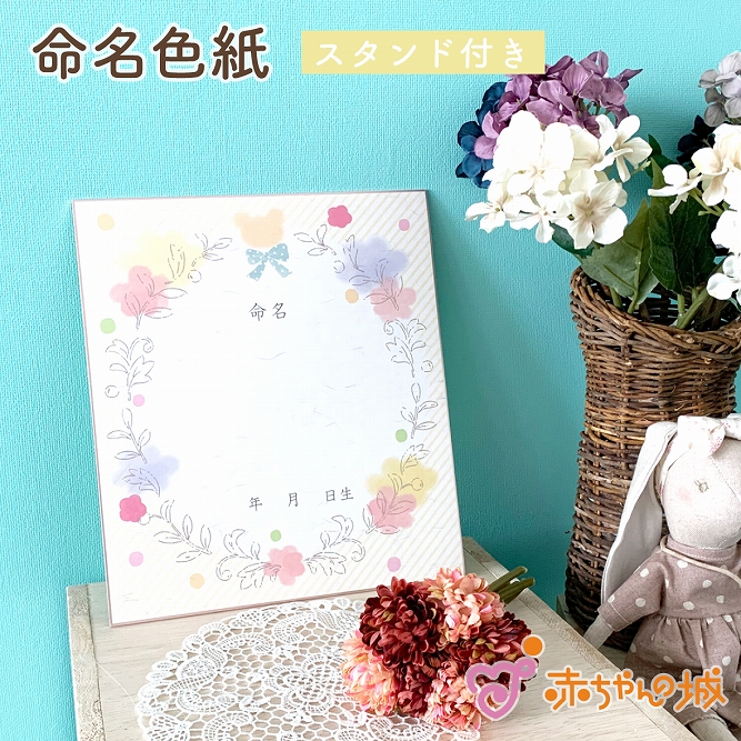 スタンドがついた命名色紙です。しっかりとした作りなので、壁にかけたり立てかけたりして飾れますよ。一般的な色紙サイズで、インテリアにもなじみます。青系、和柄のデザインもあります。