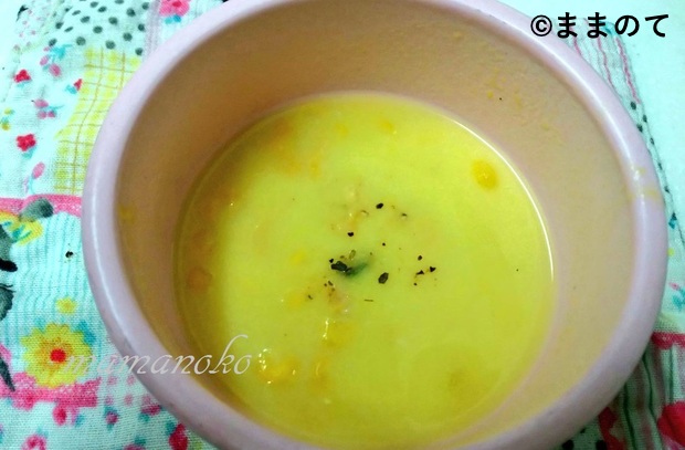 コーンの粒をのどに詰まらせるのが心配な場合は、コーン缶すべてをミキサーで細かくすると安心です。ざるや茶こしで裏ごしをすると、きめ細かなスープになります。