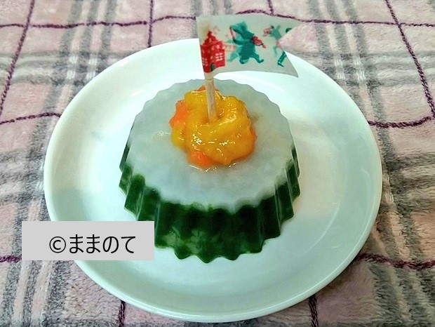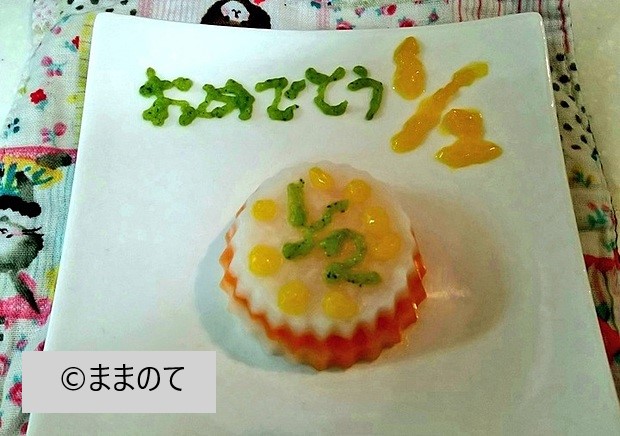 生後6ヶ月頃の離乳食は8~10倍粥が一般的なので、凍らせると立体的に見せることができます。食べるときは温めてください。お好みで旗を立てることで、華やかさが増します。旗に子どもの名前やメッセージを書いても良いですね。