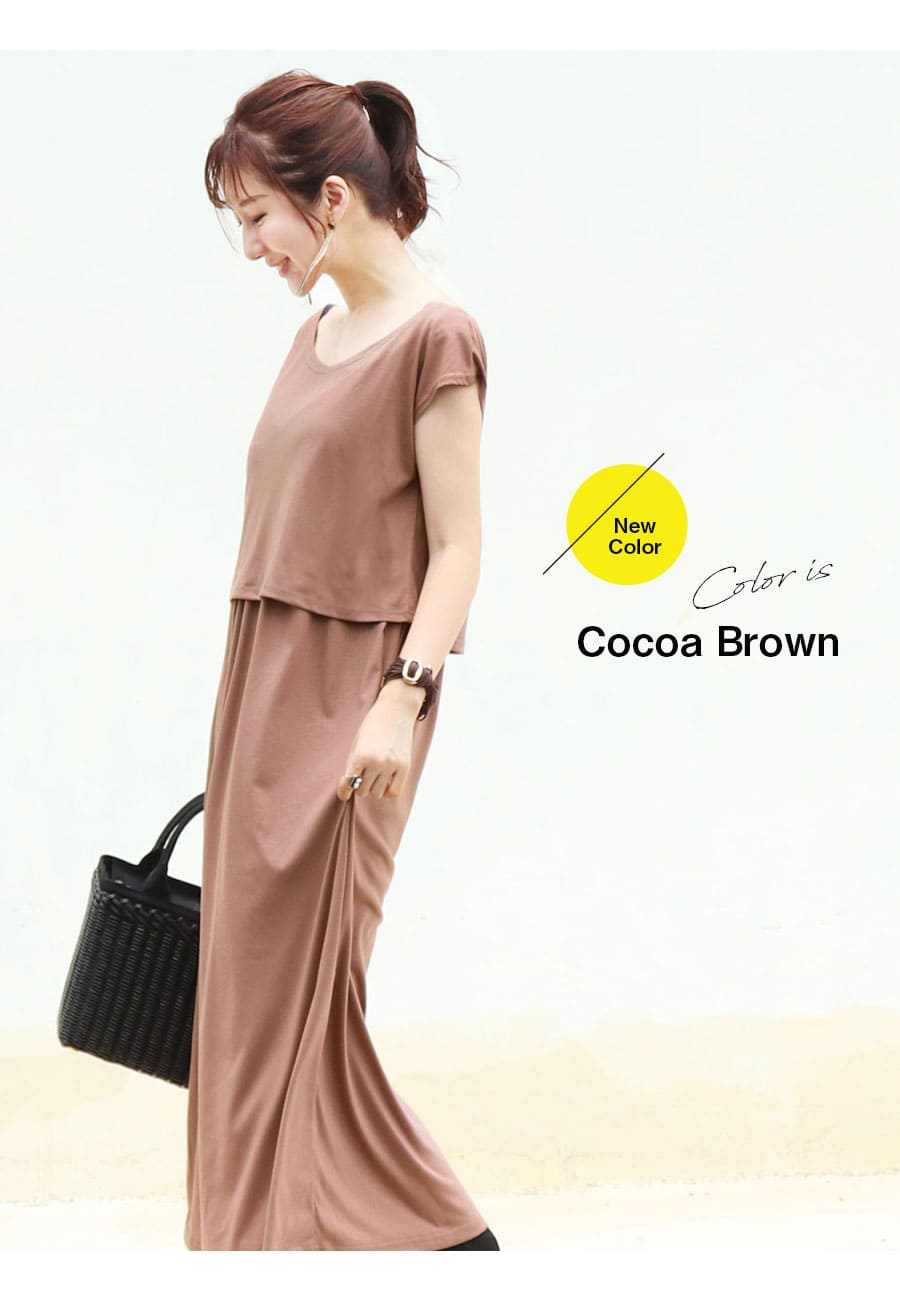 シンプルなマキシ丈なので、一枚で着たりレギンスとあわせたりとコーディネートも自在に楽しめます。前身頃を上げて授乳ができ、産後も活躍します。