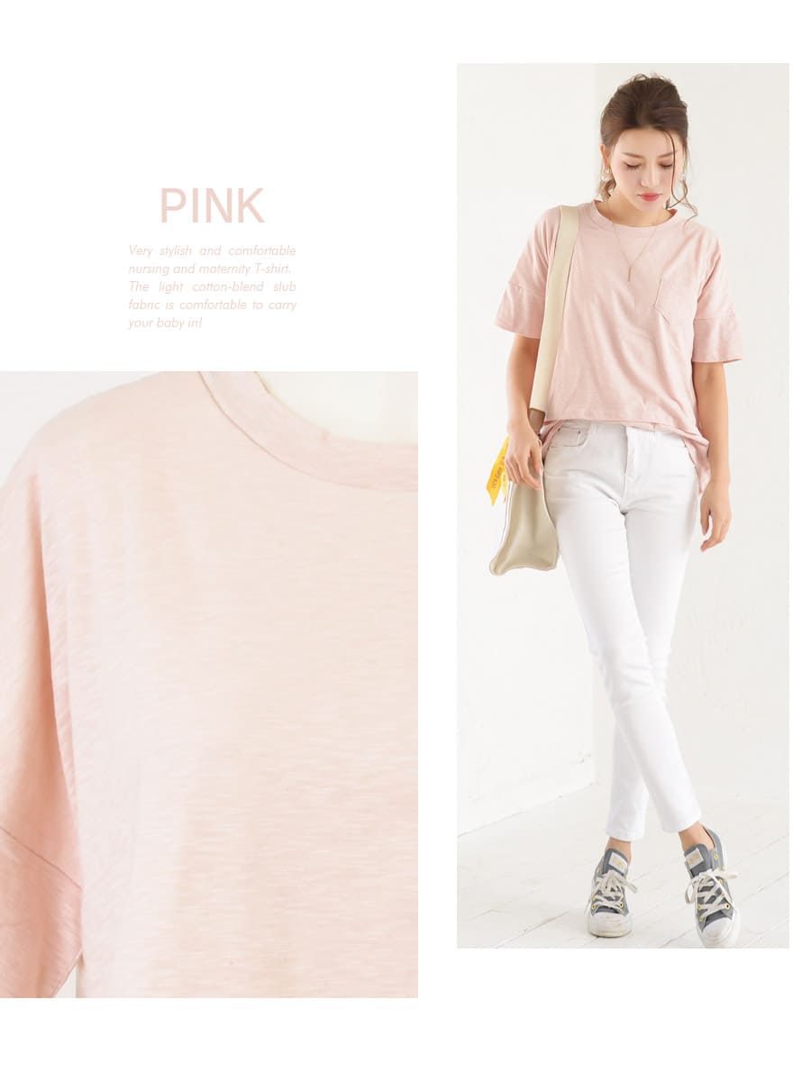さらりとした綿混スラブ生地を使用したベーシックデザインの授乳服&マタニティTシャツです。着こなし方法で着丈と袖丈が調整できるので、その日のファッションに悩まずコーデが楽しめます。ケープなしでも授乳がしやすい二重構造で、おでかけにも部屋着にも使える便利な一枚です。