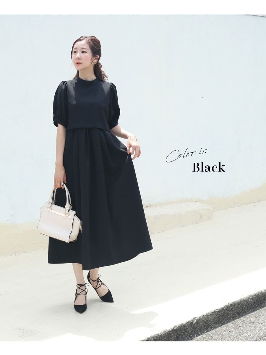 艶感のある上品な生地で仕上げたエレガントなワンピースです。ふんわりボリューミーなパフスリーブでやわらかい印象を与えつつ、高めの襟元が全体を引き締め、甘くなりすぎないのが魅力です。