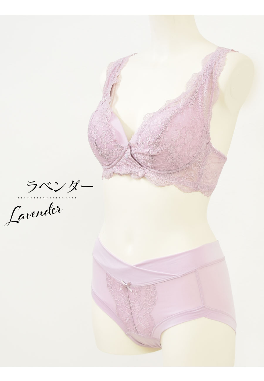 クロスオープンタイプの授乳ブラと産前産後対応のショーツのセットです。ブラジャーはストレッチレースを使い、ノンワイヤーで作られています。締めつけが少なく、胸の大きさが変わってもストレスを感じさせません。