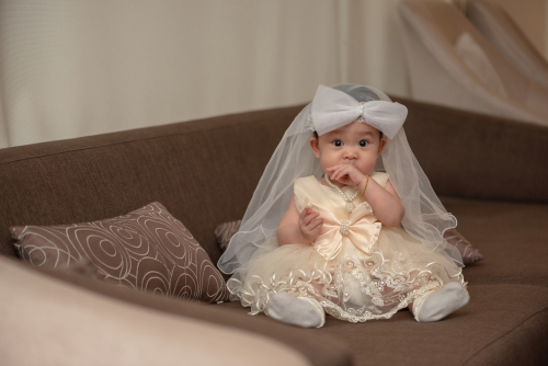 赤ちゃんの場合、結婚式の服装に特に決まりはなく、白いドレスを選んでもマナー違反にはなりません。ただし、赤ちゃんといえど花嫁のカラーである白いドレスを着ていることに抵抗がある方もいるため、花嫁さんの気持ちを大切にしたいですね。