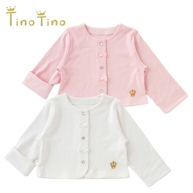 小さなリボンがふたつあしらわれた上品なデザインのカーディガンです。裾にはTinoTinoのブランドロゴも付いています。結婚式のドレスにはもちろん、入園式のフォーマルウェアにもぴったりで、普段使いもできそうな1枚です。