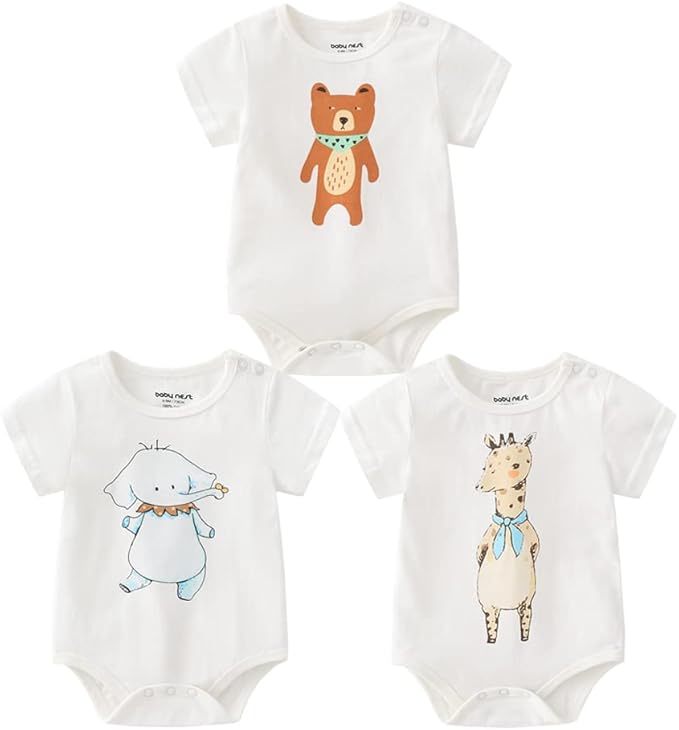 コミカルなタッチで描かれた動物柄がかわいいロンパースです。肩口にスナップボタンがついているので、着せ替えも楽にできます。綿100%で洗い替えに便利な3枚セットです。