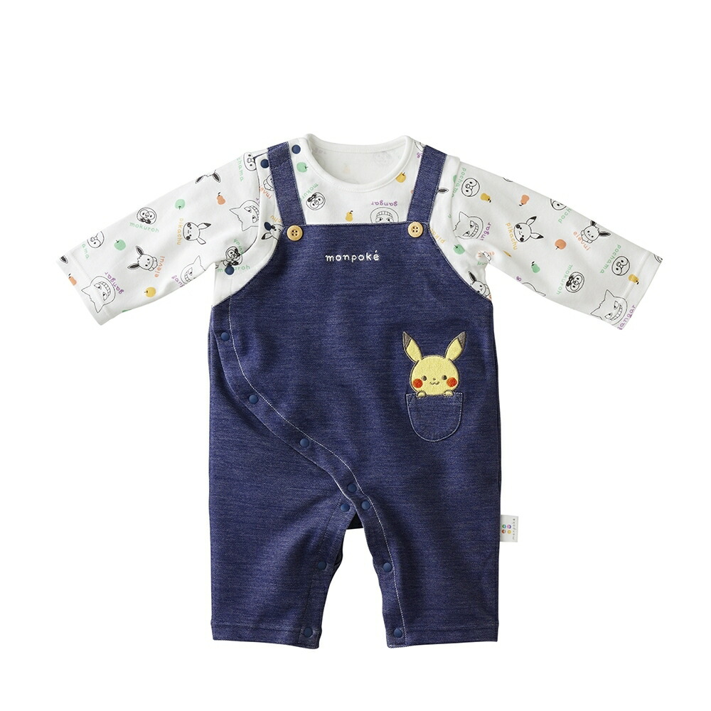 キャラクターものや洋服風のロンパースもアウターとして活躍します。こちらはサロペットを履いているように見えるロンパースです。ポケットからは人気のキャラクター「モンポケ」がちらり。色違いのベージュデザインもあります。