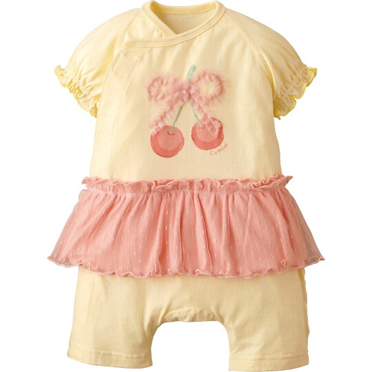「コンビミニ」の胸元のチェリーがおしゃれな夏向きのカバーオールです。腰回りのスカート部分はカットソーとチュールが2枚重ねになっていますよ。チェリーのリボン部分にもチュール素材が使われています。ラップクラッチはワンタッチで脱ぎ着せができるので、おでかけ先でのおむつ替えも手間なく行うことができますよ。