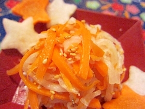 煮物には、紅白のためにんじんと大根、「亀の甲羅」の形の六角形に切ったかぼちゃ、しいたけ、その他に旬の食材なども利用します。
