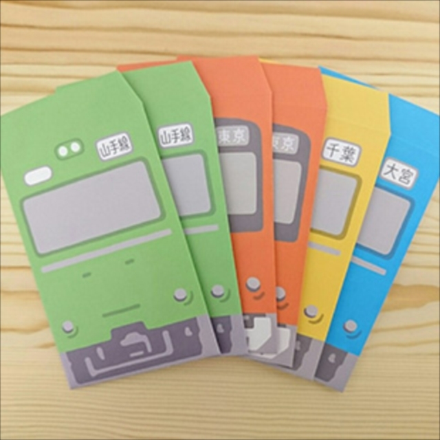 鉄道グッズショップトレニアートが手掛けるポチ袋は、在来線の通勤電車を正面から描いたデザインです。山手・中央各2枚、京浜東北・総武各1枚がセットになっています。電車や乗り物好きの男の子におすすめです。
