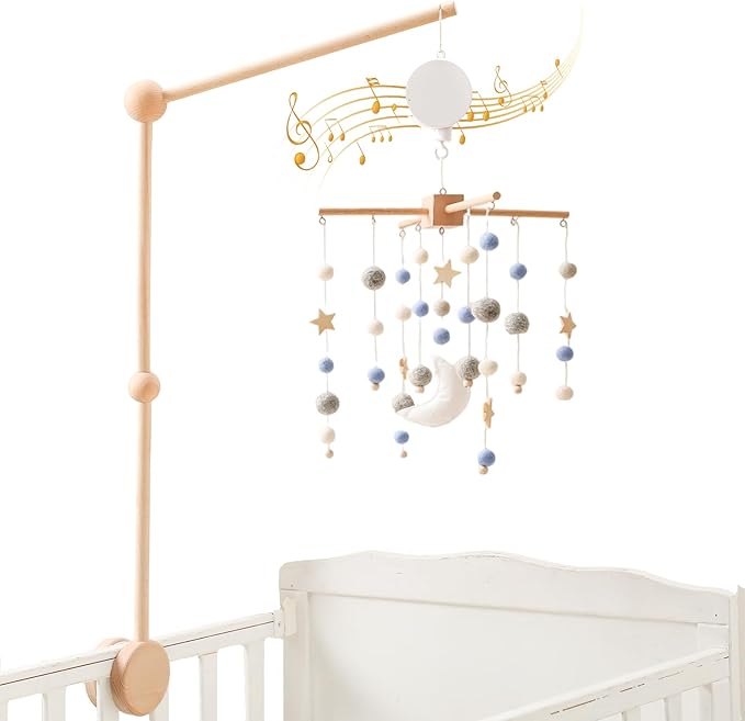ナチュラルテイストのモチーフがかわいらしいメリーです。モビールとアーム、手動のオルゴールがセットになっています。オルゴールを取り外し、自然の風で揺れるモビールとして活用もできます。