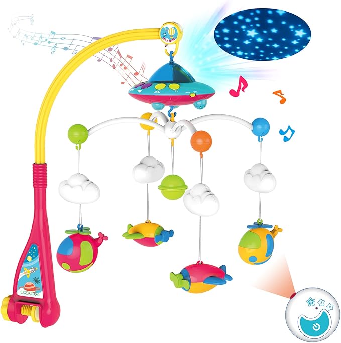 プロジェクターが一体となったメリーです。上部のUFOから投影された3色の星空の下をカラフルなヘリコプターや飛行機がくるくる回ります。メロディーは108曲を収録。便利なリモコン付きです。