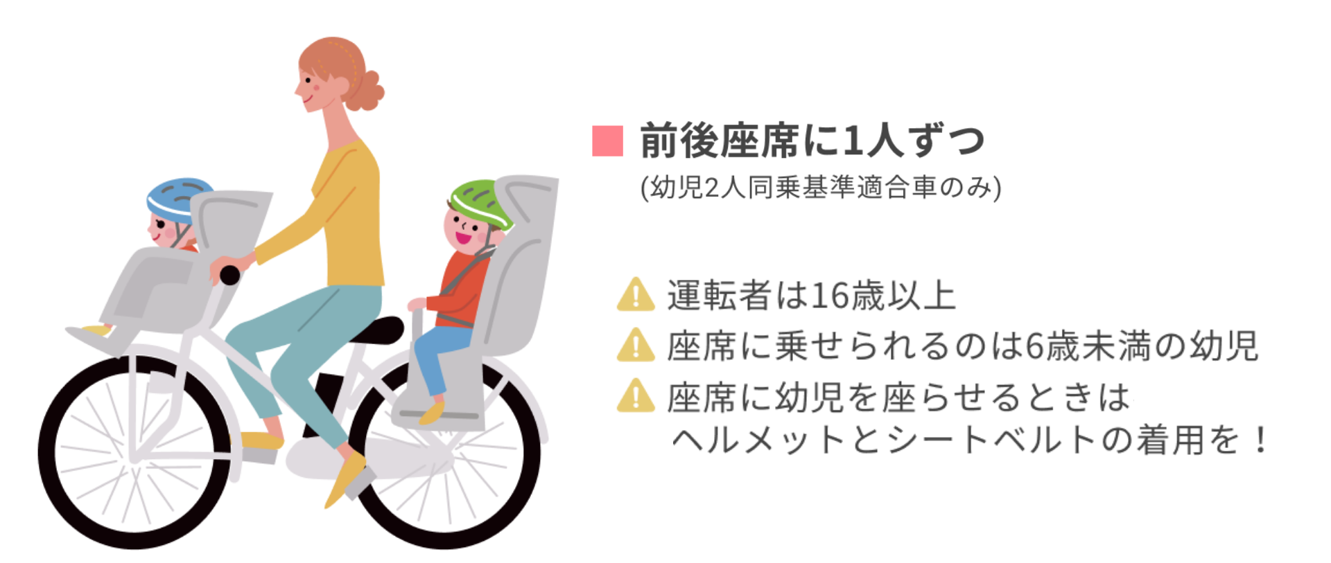 一般的な自転車に子どもを2人を座らせて運転することはできません。子どもを2人乗せる場合は、幼児2人同乗用自転車とよばれる、自転車協会の基準を満たした専用の自転車とチャイルドシートを用意する必要があります。