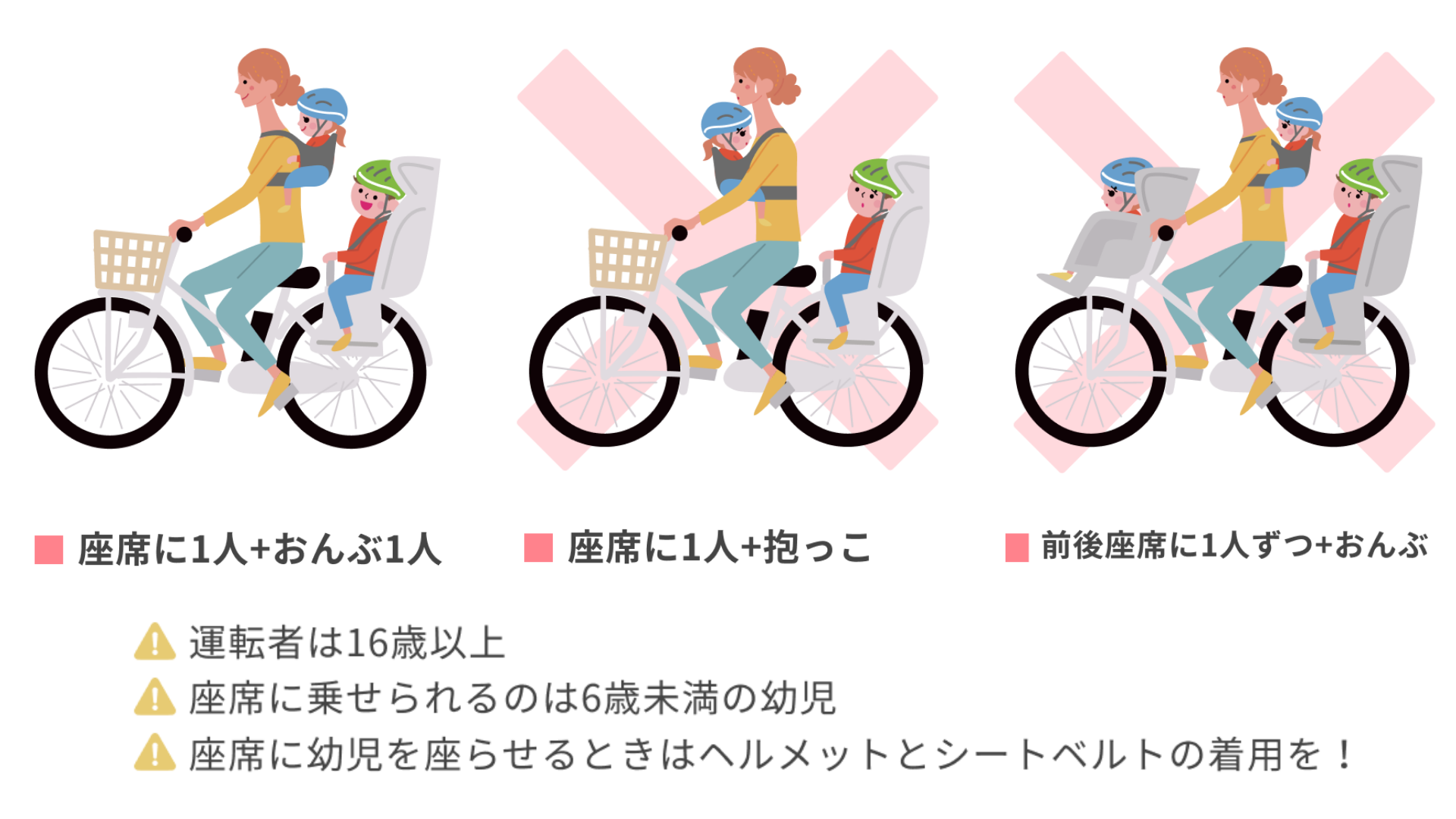 | 幼児3名(前後座席に1名ずつ・おんぶ) | × | × |