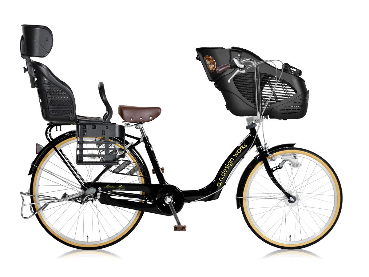 おしゃれな自転車を探している、という方におすすめなのが、a.n.design worksの自転車です。ブラックのフレームにデザインされたロゴがアクセントになっています。チャイルドシートは、前後にふたつ取り付けられており、追加購入・設置する必要がありません。自転車本体にはシマノ内装3段変速やLEDオートライト、雨の日でも制動力の高いローラーブレーキなど、快適に走行するための機能が搭載されています。