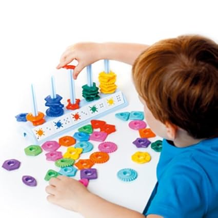 ファンラーニング シェープス&カラーズは、色と形の認識、グループ分け、順番の理解、数と量の一致、指先あそびなどが学べる知育玩具です。 見た目も可愛い三角、丸、お花など、さまざまな形のカラフルなビーズを使って色・かたちの分類を自然と学ぶことができますよ。