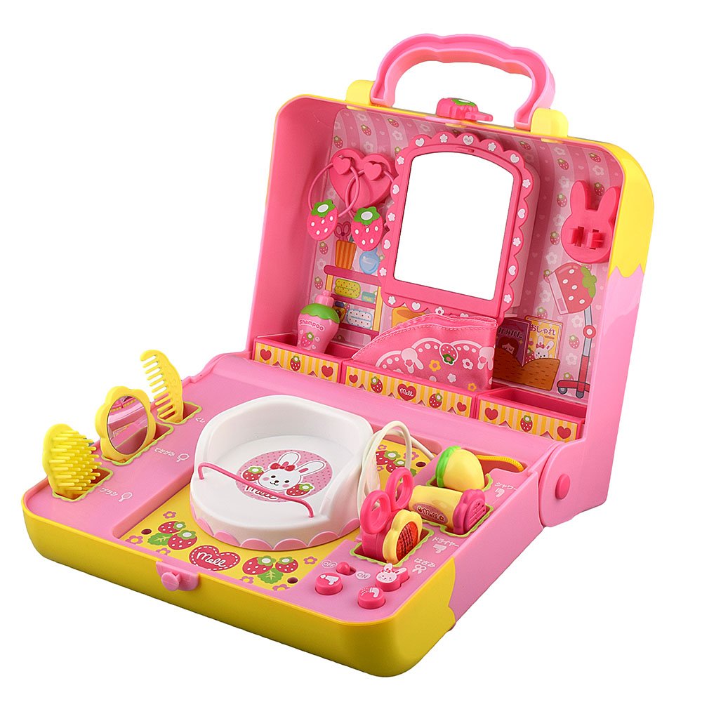 美容室セットもあります。いちごのデザインでとても可愛く、真ん中の椅子にメルちゃんを座らせて回すこともできます。そのまま音がなるはさみで髪を切ったりドライヤーで髪を乾かしてあげたりと、美容室さながらのごっこ遊びができます。鏡の部分は開くと小もの入れになっていますよ。