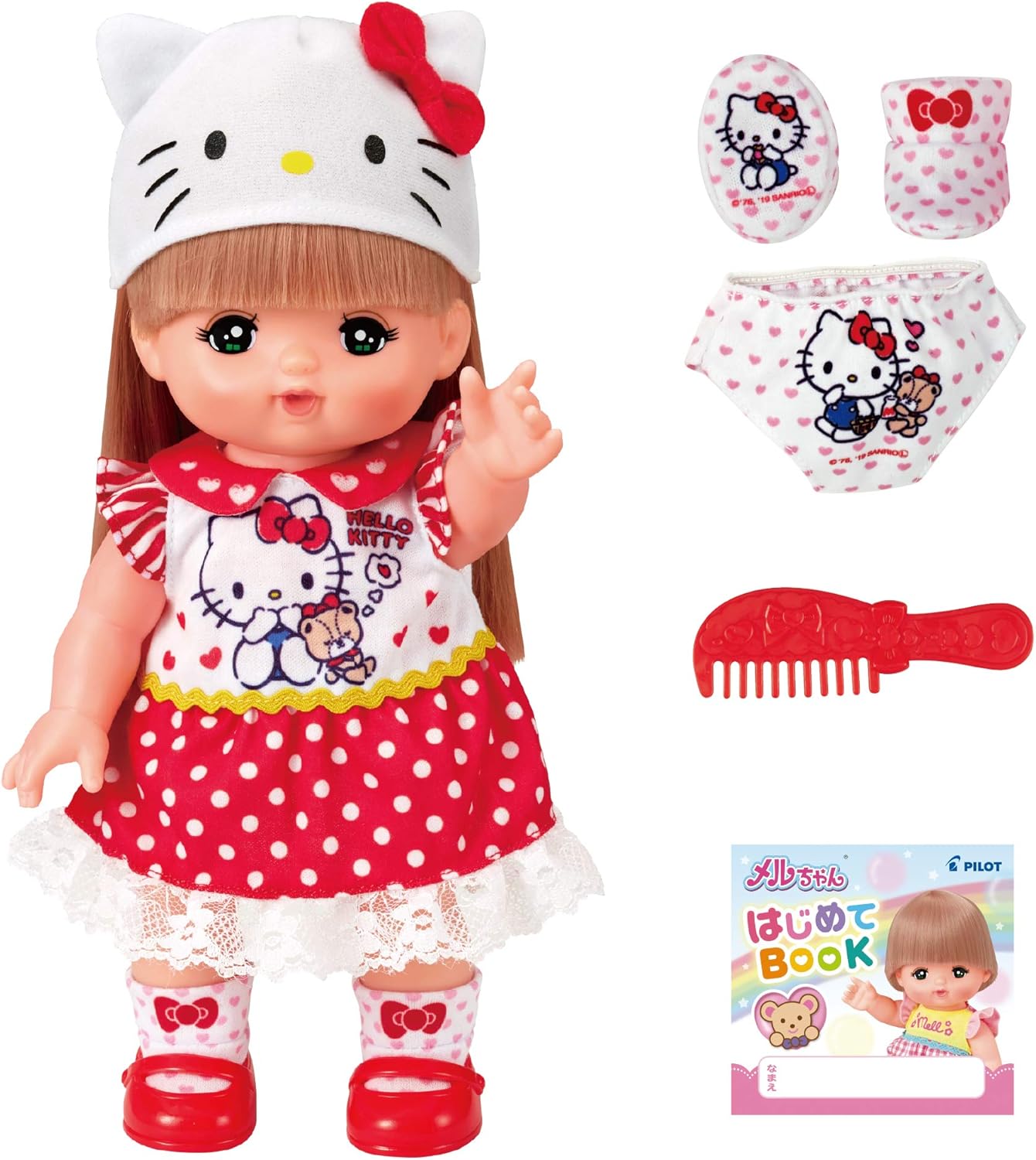 メルちゃんのお着がえにはたくさんの種類があり、着せ替えも楽しみのひとつです。こちらはキティちゃんとコラボレーションした人気の洋服です。キティちゃんの耳のついた帽子と赤いみずたまワンピース、かわいい靴下に赤い靴がセットになっています。