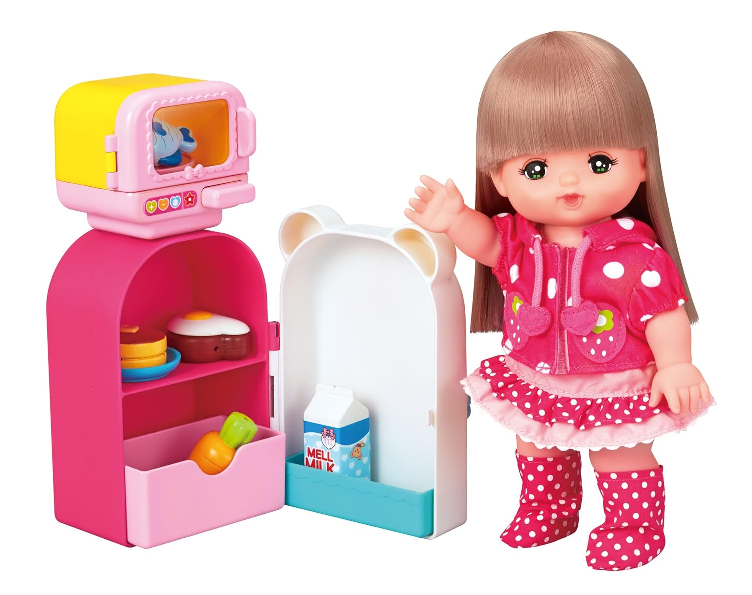 こちらも入門におすすめのメルちゃん人形セットです。入門セットに比べてグッズは少ないのですが、十分メルちゃんと楽しく遊べます。セット内容はミルクとくし、お風呂に入ると髪の色が変わるメルちゃん人形です。ミルクは逆さまにするとなくなる仕組みになっています。